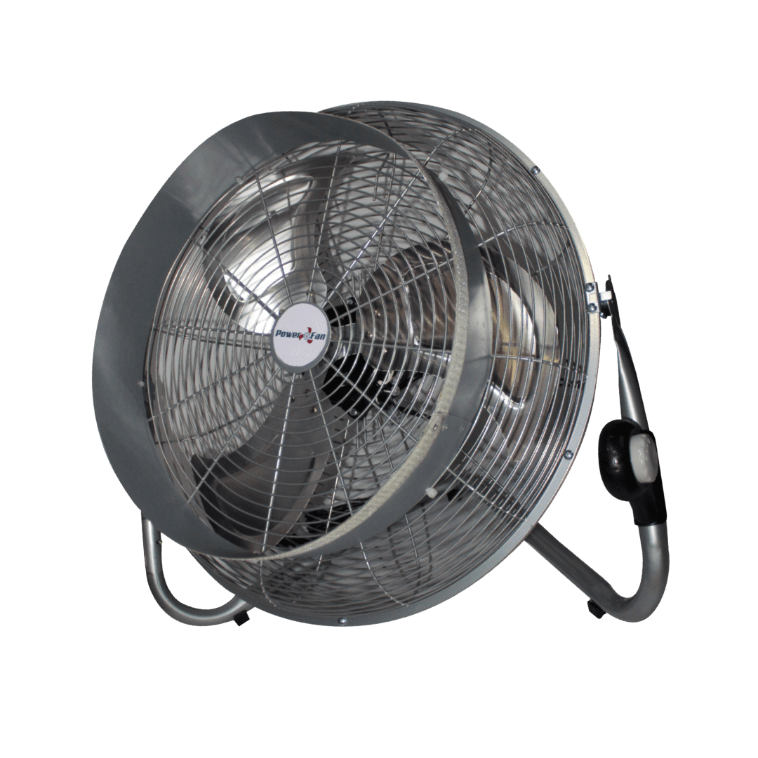 Ventilador industrial alta eficiencia, alto flujo, acabados en cromo ligero, aspas metálicas, lista para conectarse a una corriente casera