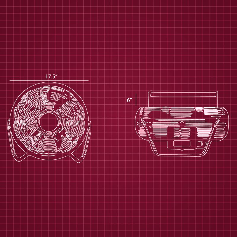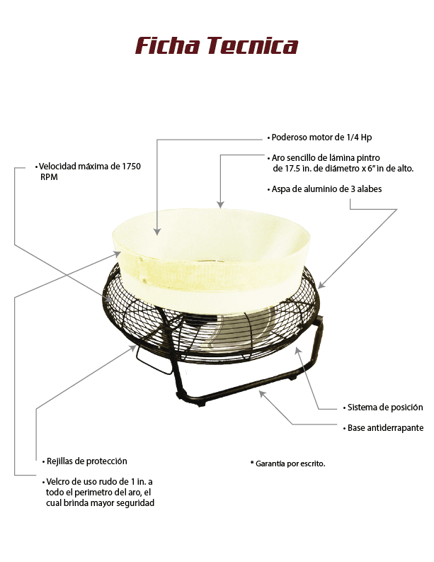 Incluye: ventilador con base, aro de 17”, terminación en velcro, base con sistema de estabilidad, interruptor giratorio de 3 velocidades y encendido/apagado.