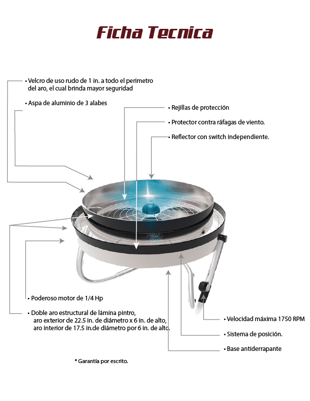 Incluye: ventilador con base en terminación en velcro para sujeción, base con sistema de estabilidad, interruptor giratorio de 3 velocidades y encendido/apagado.