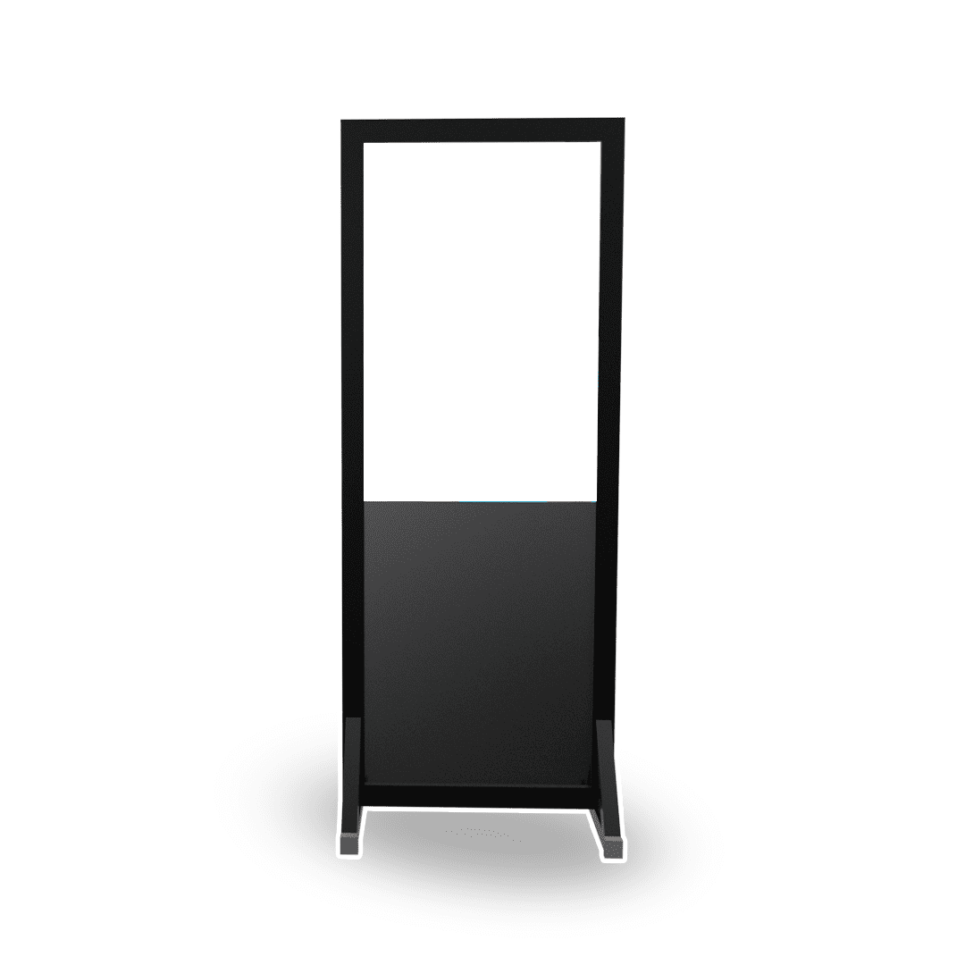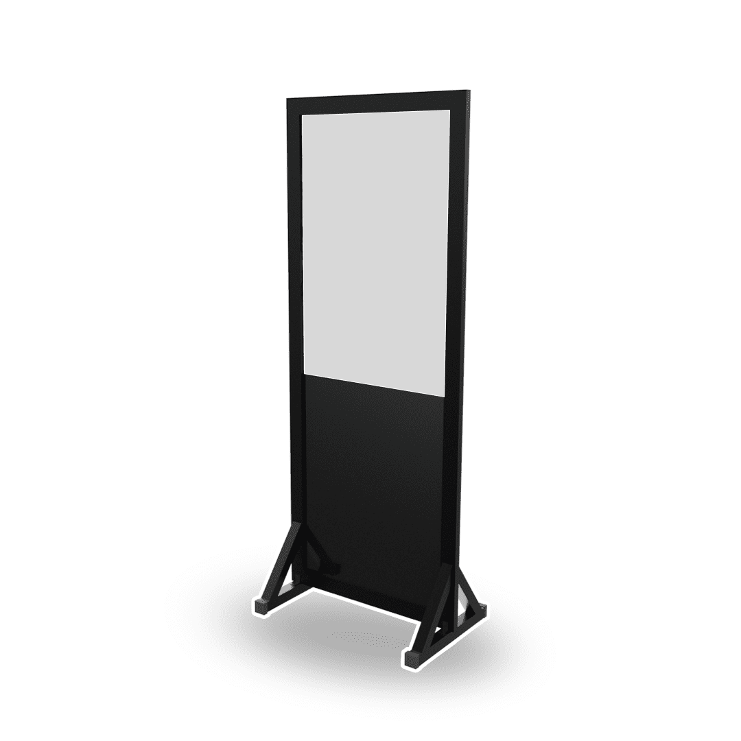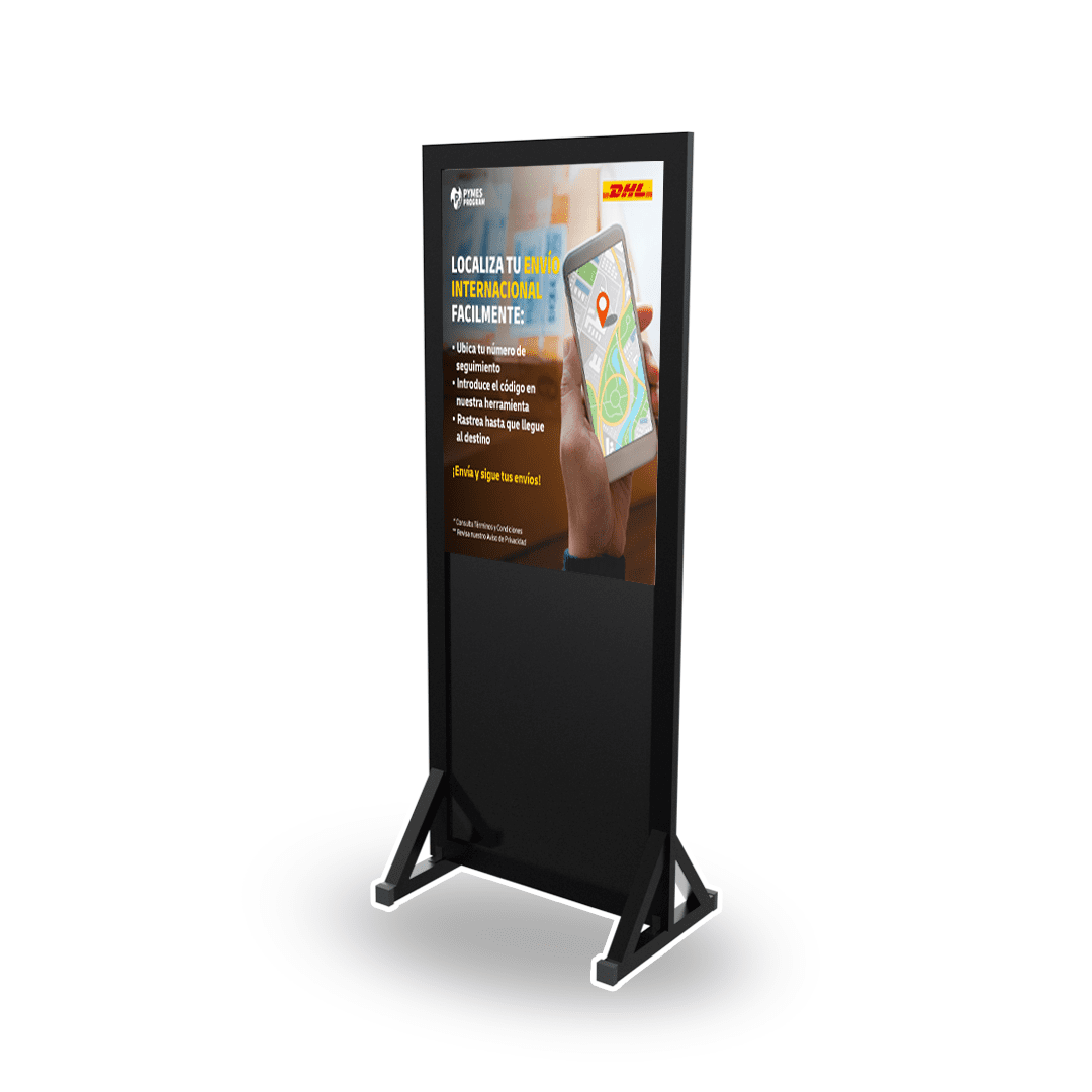 Tótem publicitario metálico con iluminación LED: estructura vertical resistente, ideal para exteriores, con luces LED integradas que garantizan alta visibilidad día y noche.